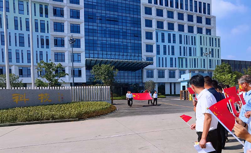 9時(shí)28分,升旗儀式正式開始。在眾人的注目下,四名旗手護(hù)衛(wèi)著國旗入場(chǎng)。伴隨著激昂的《義勇軍進(jìn)行曲》,鮮艷的五星紅旗冉冉升起。緊接著,在《明天會(huì)更好》的動(dòng)人旋律中,錦蕭科技司旗也緩緩升起。鮮紅的國旗和錦蕭的司旗在公司生產(chǎn)基地上空迎風(fēng)飄揚(yáng),給員工堅(jiān)定的信念和無限的力量!